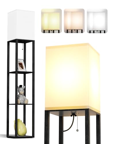 Home > Floor Lamps > PAZZO Floor Lamp with Shelves by Solid Wood, Modern Shelf Floor Lamp with 3 Color Temperature, Linen Lampshade and Storage Shelves for Living Room, Bedroom, Bulb Included(Black) ; PAZZO