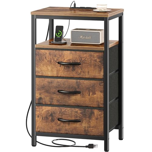 Home > Nightstands > Nightstand with Charging Station, 27.6 Inch Bedside Table with Fabric Drawers, End Table Side Table with USB Ports and Outlets, Night Stand for Bedroom, Rustic Brown ; Visit the Huuger Store
