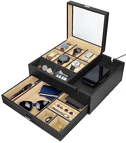 Home > Watch Cabinets & Cases > HOUNDSBAY Commander Dresser Valet Watch Box Case & Mens Jewelry Box Organizer with Smartphone Charging Station and Cufflink Box (Black/Ivory) ; Visit the HOUNDSBAY Store